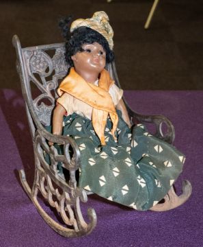 A SFBJ black bisque head doll:, together with a cast iron rocking chair.