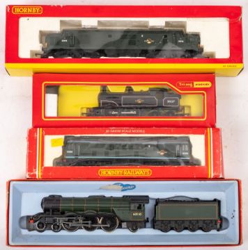 Hornby OO/HO gauge. A group of locomotives comprising BR green 4-6-2 'Robert The Devil No. 60110': BR black 0-4-4 tank locomotive No. 30027, BR green Diesel DB6074 and R253 BRB-B Diesel Electric D5206 (4)