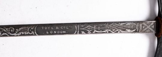 An 18th century mourning sword: the straight tri-form blade with etched decoration to ricasso over a pieced oval shell with single quillon and guard, one piece steel grip and pommel, in a black velvet scabbard with single suspension, blade length 82cm, together with a Masonic court sword by Toye of London (2)