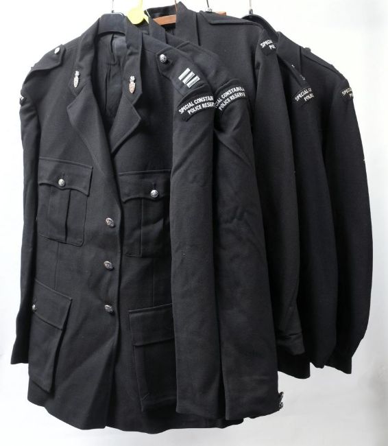 Three Devonshire Constabulary Special Constable Reserve uniforms and two jackets.: