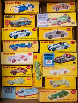 A group of various Dinky racing cars: including No. 238 Jaguar Type D racing car, No .23H Ferrari Racing car and others (reprinted boxes, some vehicles repainted or in playworn condition)
