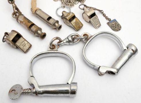 A pair of Hiatt handcuffs: together with five various whistles: including an Acme Referee and an Acme City.
