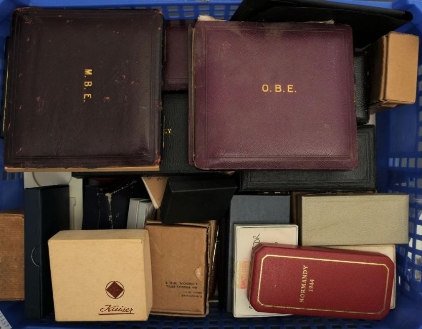 A collection of empty medal boxes: mainly British issue including MBE, CBE and others (poor condition)