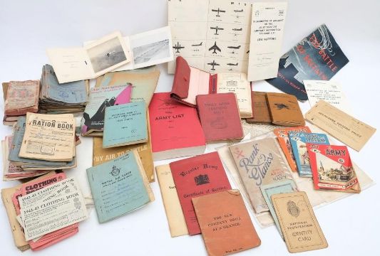A collection of various military handbooks and regulations: together with a collection of WWII ration books and related ephemera.