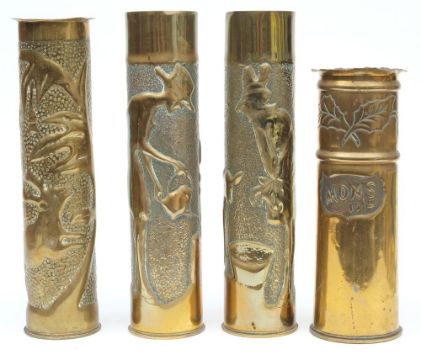 A pair of Trench Art vases: with stipple ground and repousse decoration, together with two other Trench Art vases one inscribed 'Mons 1914' (4)