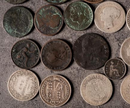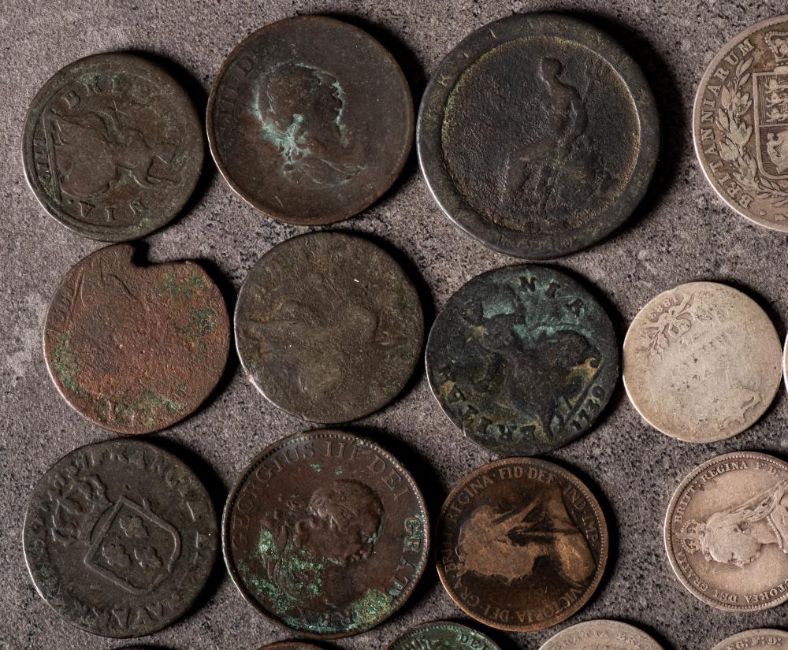A group of English silver coins: including an 1889 Crown, 1887 & 1880 halfcrown, 1857 shilling etc. together with a group of copper coins.