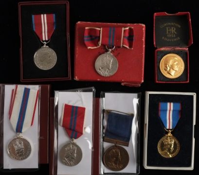 A group of seven Elizabeth II Coronation and Jubilee medals and medallions: comprising two Coronation Medals 1953, a Souvenir Medallion 1953 , Royal Visit To New Zealand Medal 1953-54, a Jubilee Medal 1977 (reproduction) , a Golden Jubilee Medal, a Diamond Jubilee medal and two empty Diamond Jubilee boxes. (9)
