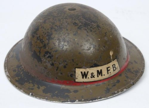 A WWII Auxiliary Fire Service Leading Fireman's Mk II steel helmet 'W&M FB': green with single red band and transfer to shell, with liner and chin strap.