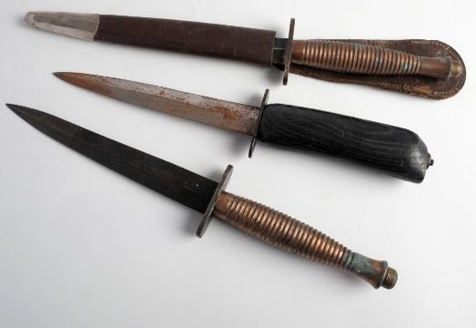 Two Fairbairn Sykes pattern knives: Third Pattern with cast ribbed grip, in brown leather scabbard, together with a Fairbairn Sykes pattern blade with replacement wooden grip, all unsigned (3)