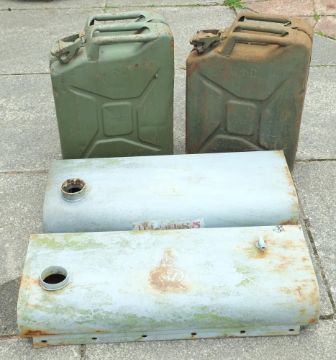 Two WWII period petrol tanks: each with remains of 'GRVI' decoration to top: together with two later Jerry cans (4)