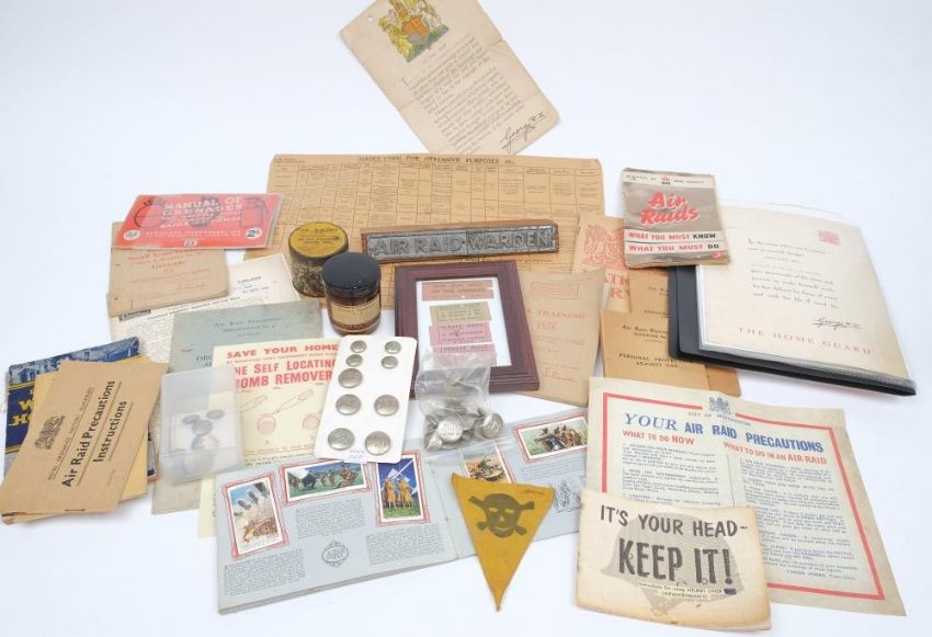 A collection of WWII ARP buttons and ephemera: including 'Air Raid Precautions Handbook No.1', 'Air Raid Precautions Memorandum No.4', also a cast alloy Air Raid Warden door sign converted to a desk nameplate and related items (a lot)