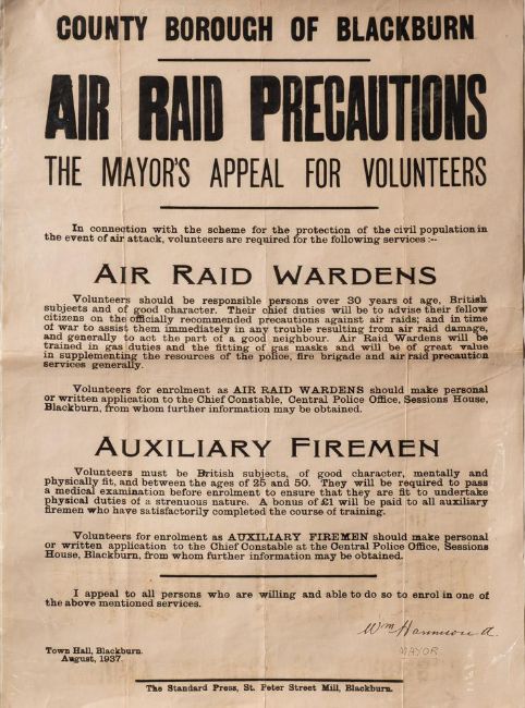 A WWII County Borough of Blackburn Air Raid Precautions poster: asking for volunteers dated 1937 and signed by the mayor, together with four other WWII period ARP posters and a group of later reproductions military posters etc. (a lot) (poor condition)