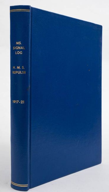 A WWI period manuscript W/T Signal log, 1917-1921, including entries for HMS Repulse and HMS Botha: also several entries for torpedo and depth charge practice and maintenance, rebound in blue American cloth boards with gilt stamped spine.