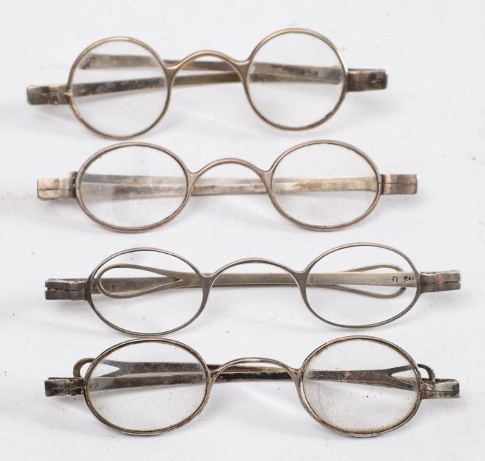 Four pairs of 19th century silver spectacles: London 1822, London 1835, Birmingham 1871 and one other pair (no date)