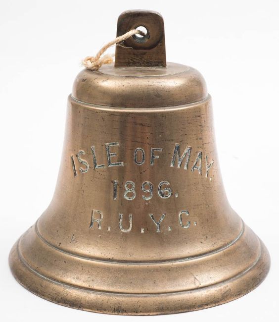 A ship's bell for the converted steam fishing vessel 'Isle of May 1896': block suspension over body inscribed and dated and also initialled 'RUYC' for 'The Royal Ulster Yacht Club', 21cm high. (lacks clapper)*Notes- Built in 1896 and operated by the Anstruther Steam Fishing Line Co. Kirkcaldy and converted to a steam yacht in 1905. Registered owner in 1914, Granville E Craig, County Down Northern Ireland.