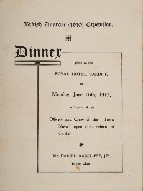 A menu for the dinner held for the return of the British Antarctic (1910) Expedition to Cardiff, Monday June 16th 1913:.