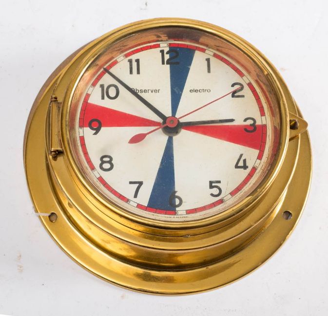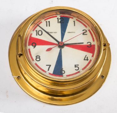 An Observer Electro brass cased quartz radio room bulkhead clock: 22cm diameter.