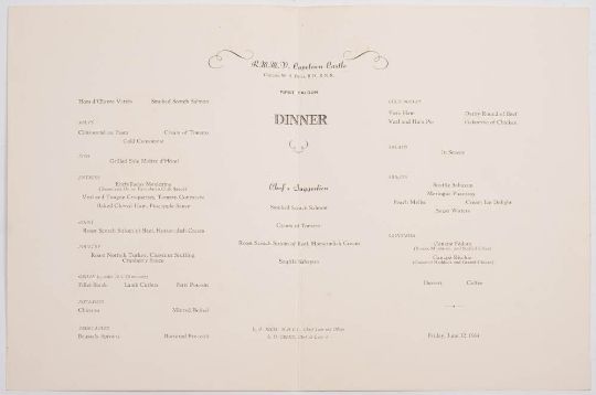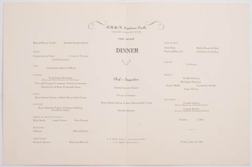 A collection of eleven Union Castle Line menus, circa 1963-64: comprising two for SS 'Kenya Castle' and nine for RMMV 'Capetown Castle', also a menu for Lloyd Triestino MM 'Africa' (12)