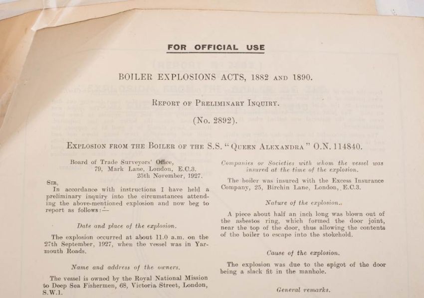 Boiler Explosions Acts 1882 & 1890. A collection of approximately 100 explosion reports aboard various vessels: including SS Queen Alexandra, SS Southwark, the steam fishing vessel Eagle off Grimsby, SS Kelburne, SS Australind and others.