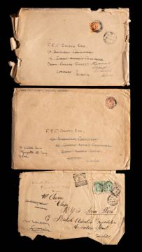 A section of an envelope addressed to ' Mr Davies 'Chips' RYS Terra Nova, c/o British Antarctic Expedition': with Cardiff and London postmarks circa 1913, together with two Scott Polar Research Institute, Cambridge envelopes addressed to 'FEC Davies, Discovery Committee' (3)