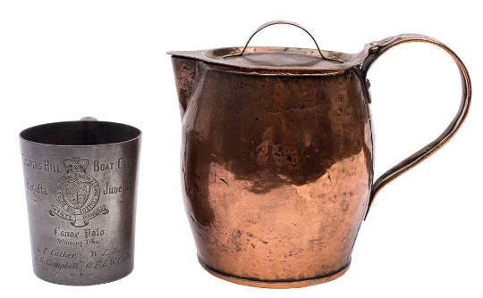A copper jug in the Arts & Crafts manner made from copper salvaged from HMS Britannia: stamped to base 'Made from Old Copper taken from HMS Britannia Cadet Training Ship at Dartmouth 1869-1905', 16cm high. together with a pewter trophy tankard for 'Coopers Hill Boat Club 1887' (2)