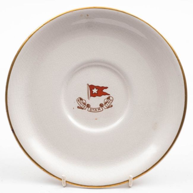 A White Star Line circular bouillon stand: with transfer emblem to centre and gilt rim, 19.4cm diameter.