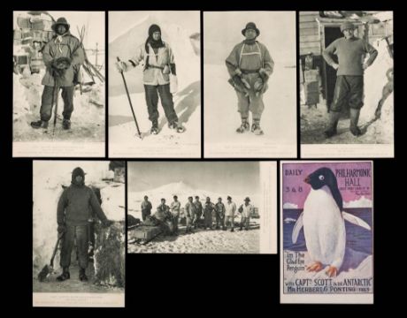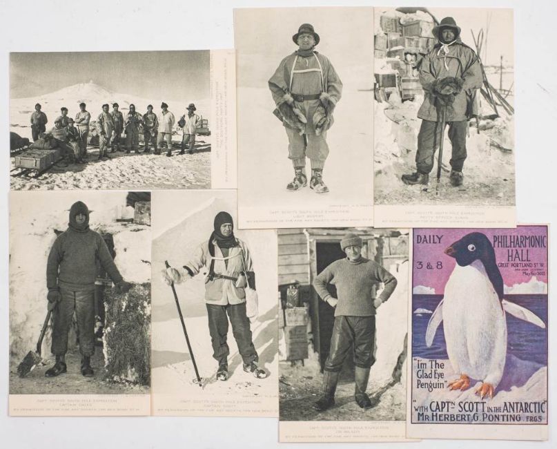 British Antarctic 'Terra Nova' Expedition 1910-1913. A group of seven postcards from the Herbert Ponting (1870-1935) lectures 'I'm The Glad Eye Penguin': comprising an advertising card version of Ponting's photograph of an Adelie penguin titled 'I'm The Glad Eye Penguin', 'With Captn Scott In The Antarctic. Mr Herbert Ponting FRGS', 'Daily 3 & 8 Philharmonic Hall Great Portland Street', with newspaper reviews to the reverse, together with portrait cards of 'Captain Scott', 'Captain Oates', 'Lieut Bowers', 'Dr Wilson' and 'Petty Officer Evans',and a group card 'The Southern Party 1911' published by The Fine Art Society after Ponting's original photographs. (7)*Notes- Herbert Ponting (1870-1935) was a professional photographer who was the expedition photographer and cinematographer on Captain Scott's British Antarctic Expedition 1910-1913 during which he captured some of the most enduring images of the Heroic Age of Antarctic Exploration. In 1914 he gave a series of lectures with films of the expedition. The advertising card in this group is a different version from others as this card does not have the line 'Scene after scene of imitable comedy.-Daily Telegraph' to the front lower margin but is included in the full review on the reverse of the card.