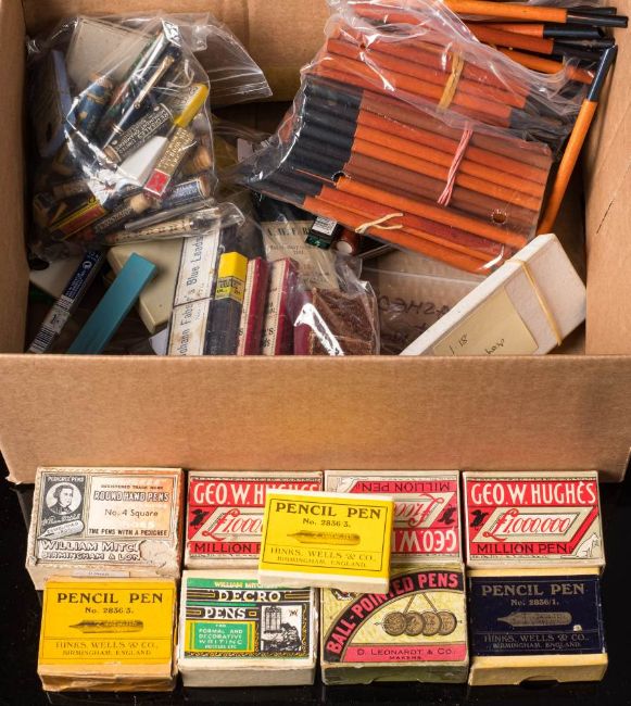 A collection of school dipping ink pens: together with a collection of pen nibs including Hinks, Wells & Co, William Mitchel and others, together with a collection of various propelling pencil leads (a lot)