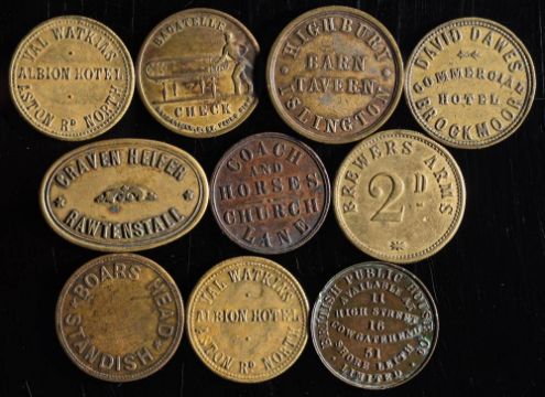 Ten Public House and Inn tokens, including a 6d token for the Barn Tavern, Islington.: