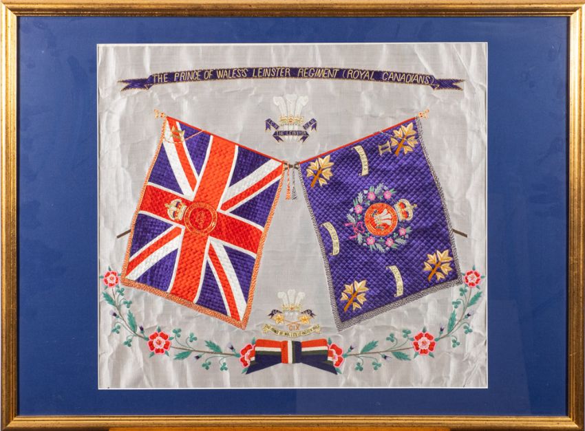 A late 19th /early 20th century regimental silk for the Prince of Wales's Leinster Regiment (Royal Canadians):, with crossed flags surrounded by fleur de lys and floral garland, framed and glazed, 51 x 57cm.