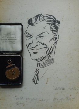 A 9ct gold and enamel medal for Douglas Motors: awarded to H. M. Hicks,The Wessex League Trials, 1927, 8.82gms, together with an ink caricature by Grimes entitled 'Arold Icks' and inscribed in pencil "Can anyone ever forget that grin", 27 x 9cm.