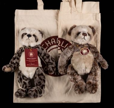 Two Charlie Bears Teddy bears: 'Cindy' and 'Tiana', designed by Isabelle Lee, together in a Charlie Bears bag.