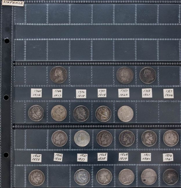 A Collection of sixpences: including 1746, 57, 18, 1816, 17, 18, 19, 20, 26, 27, 28, 29, 31, 34, 35, 37 and a good selection of Victorian Young head sixpences etc.