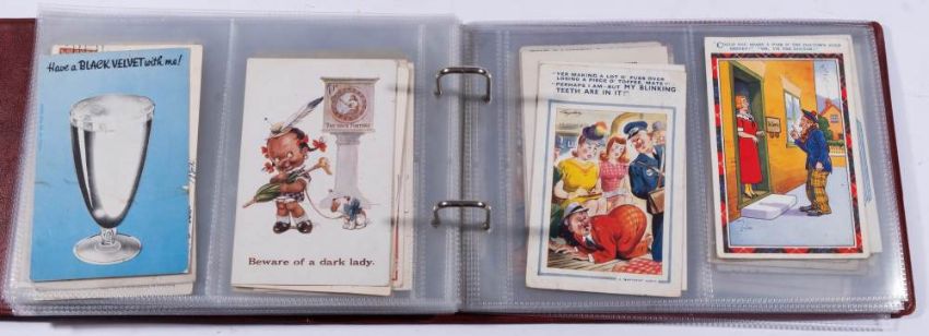 An album of eighty eight comic postcards: artists include Bob Wilkin, Brian White, Donald McGill, Reg Carter and others, approx 88 cards.