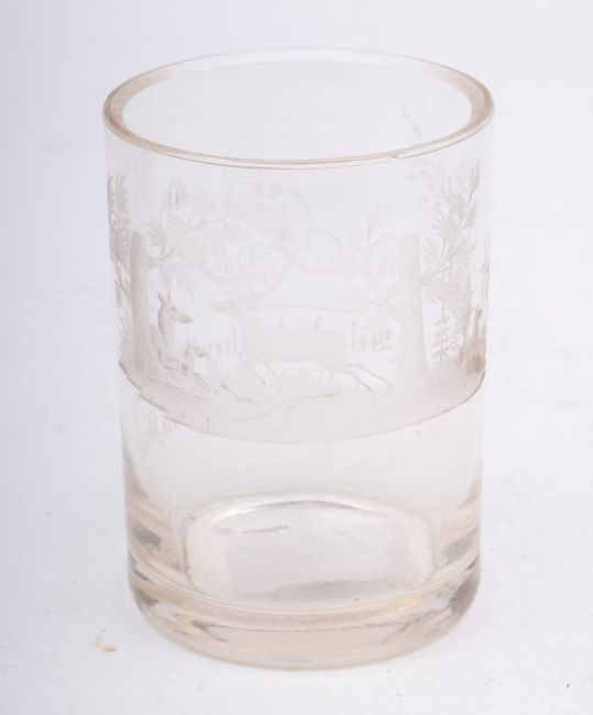 A late 19th century Bohemian etched glass tumbler: one side with the initials 'JR' over verse, the other etched with a woodland scene with stag and deer, 11cm high
