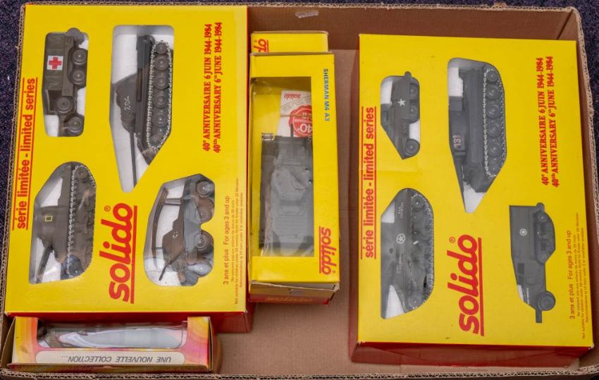 Solido. A boxed group of military vehicles: including two 40th Anniversary boxed sets, a Sherman M4A32 tank and two other vehicles.