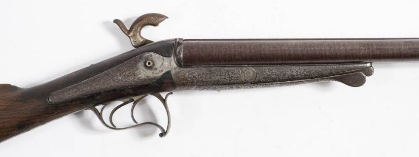 A Lefaucheux 16 bore double barrel pinfire sporting shotgun:, 27 3/4 inch Damascus barrels, scroll chased tang and backlock action, steel lever fore end decorated en suite, on a walnut stock (109cm long. some damage).