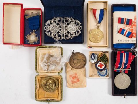 A WWII War Medal together with a collection of enamel badges etc. : including Girl Guides, Red Cross and others , also an Italian WWII Grandi manovre in Alto Adige Trento medal in envelope of issue.