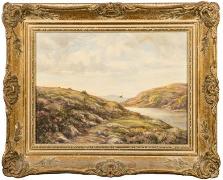 * W. E. Barrington Browne [1908-1985]-By The Loch Side; grouse in flight over a moor:-oil on canvas, 30 x 40cm.* Provenance. Rowland Ward, Piccadilly, London.