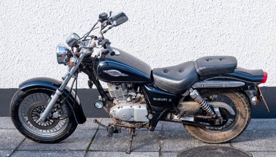 A 1999 Suzuki G7 Marauder 125cc motorcycle: registration 'T814 SFB', 13869 miles, black and chrome finish. MOT expired August 2009 (no battery but has been running at time of cataloguing)