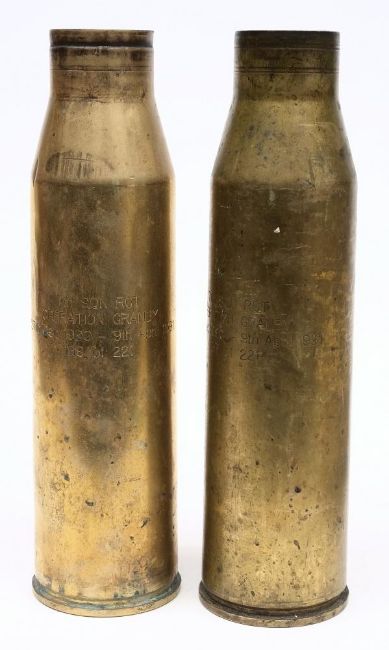 Of Gulf War Interest. A pair of 60mm brass shell casings: engraved '7th Sqn RCT Operation Granby 27th Dec 1990 - 9th April 1991' and numbered '137 of 221' and '138 of 221' respectively, 35cm high (2) *Notes-Operation Granby was the code name given to British military operations during the Gulf War.