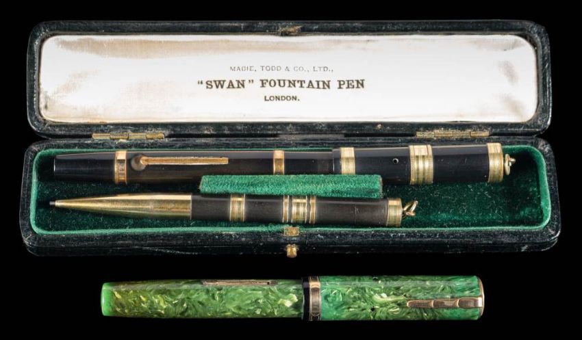 A Waterman's Lady Patrica 'Jade' fountain pen, circa 1930 with 14ct gold MWT nib: together with a 1920s Swan ring top black fountain pen and pencil in original box (no nib)