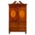 A fine mahogany and marquetry linen press in George III Sheraton style, 19th century,: the scrolled 'broken' swan neck pediment and dentilled cornice with floral paterae, oak sprigs and bellflower swag inlay, above twin doors each with a central urn in an oval satinwood reserve, beneath beribboned festoons above scrolling foliate arabesques, all within coromandel outer borders; above two short and two long drawers, all with conforming marquetry and edging, on turned and waisted urn form feet; 231cm high, 138cm wide, 62cm deep.
