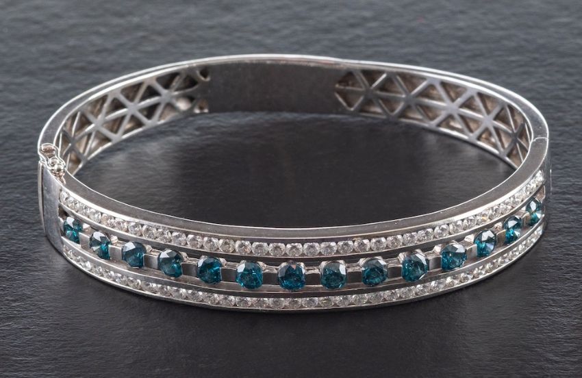 A hinged gold bangle with treated blue, round, brilliant-cut diamonds and white, round, brilliant-cut diamonds,: total estimated weight of white diamonds, ca. 2.10cts, stamped '14K', inner diameter of bangle ca. 6.6cm, total weight ca.37gms.