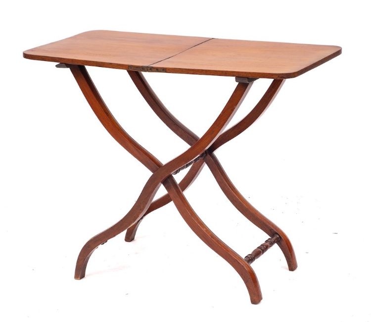 A Victorian mahogany coaching or butler's table, late 19th century: the top hinging downwards at the centre into the folding 'X' frame base; the serpentine legs with knop turned stretchers; 70cm high, 85cm long, 43cm wide