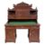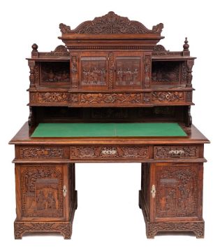 A Chinese carved wood pedestal desk, early 20th century,: with all over decoration of flowers, foliage, fruit and figures, the breakfront superstructure with a moulded cornice, with shaped foliate scroll surmount centred by a flowerhead, enclosed by a pair of panel doors decorated with figures each before a screen, flanked by an open compartment to either side and containing three frieze drawers with cloud bands and blossoming foliage, the pedestal bases each enclosed by a door with figures in a pagoda garden setting, carved with Chinese character marks to the backgrounds, perhaps the maker's signature; on bracket feet, 164cm high, 153cm wide.