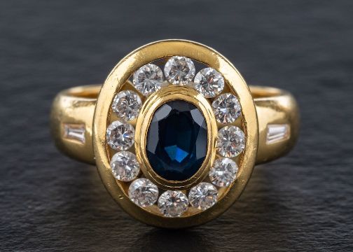 A sapphire and diamond cluster ring,: calculated sapphire weight ca. 0.75 ct, total estimated diamond weight ca. 0.65cts, stamped '750', and 'Charles Greig', length of ring head 1.4cm, ring size I, total weight ca.8.2gms.