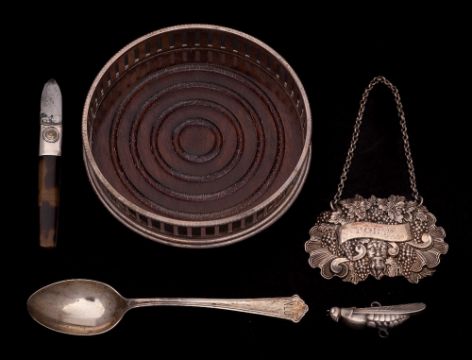 A mixed lot of collectable silver, various makers and dates: includes wine label, coffee spoon, dragonfly suspension, manicure knife and plated bottle coaster.