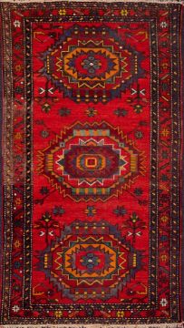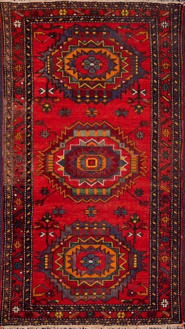 A Turkish rug:, the red field with triple serrated stellar medallions, enclosed by a similar stellar meander border, 212cm x 121cm, also a Turkish rug, the shaded brown field with a central indigo hexagonal pole medallion and main shaded brown border, 245cm x 133cm.
