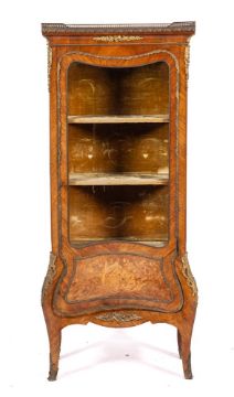 A tulipwood, marquetry and glazed vitrine in Louis XV style, early 20th century,: the top with brass three-quarter gallery; the door and sides with shaped glass panes within brass edges; the bombe base section with inlaid floral motifs and further gilt metal mounts, on short cabriole legs; 160cm high, 71cm wide, 38cm deep